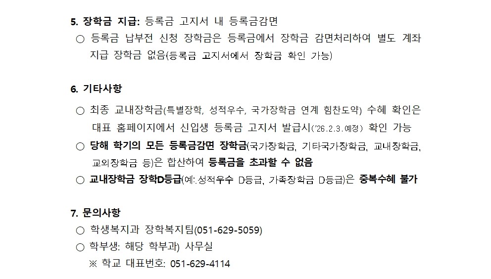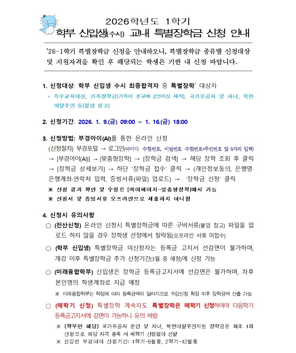 [학부] 2026학년도 1학기 학부 신입생(수시) 교내 특별장학금 신청 안내